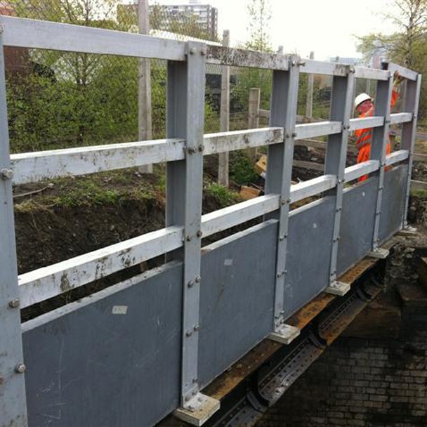 Renovations to this bridge were undertaken by a national civil engineering company and required the renewal of ballast retaining panels. We were approached with a design including heavy duty GRP panels (75mm thick) used in combination with pultruded GRP I-Beams to form the framework.